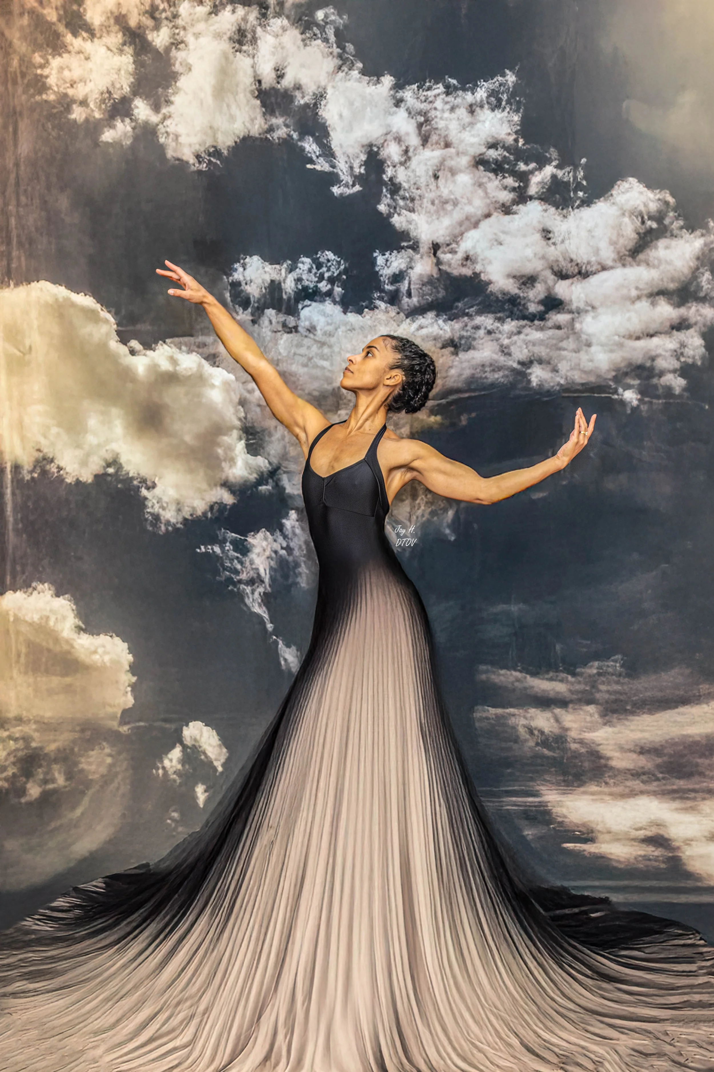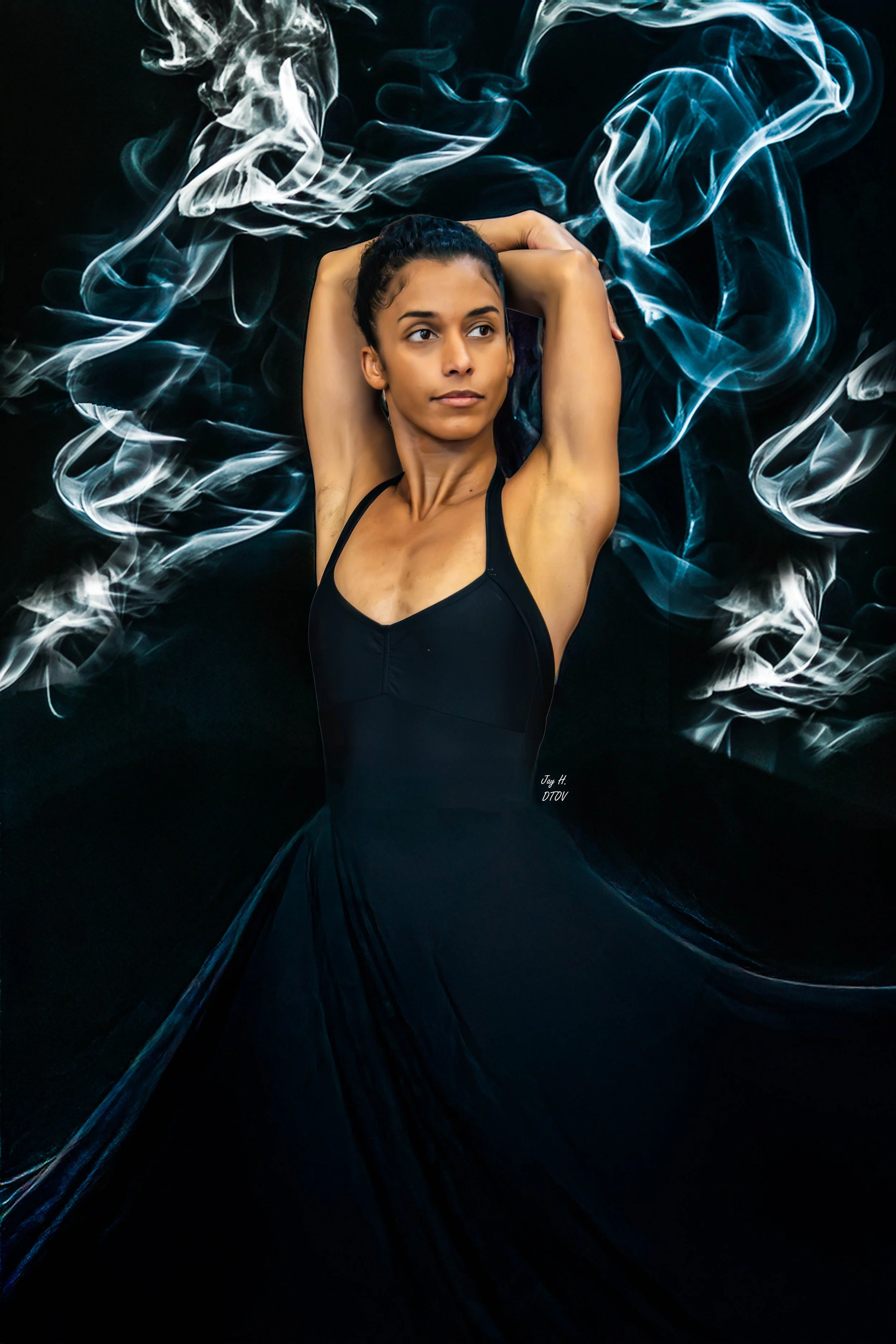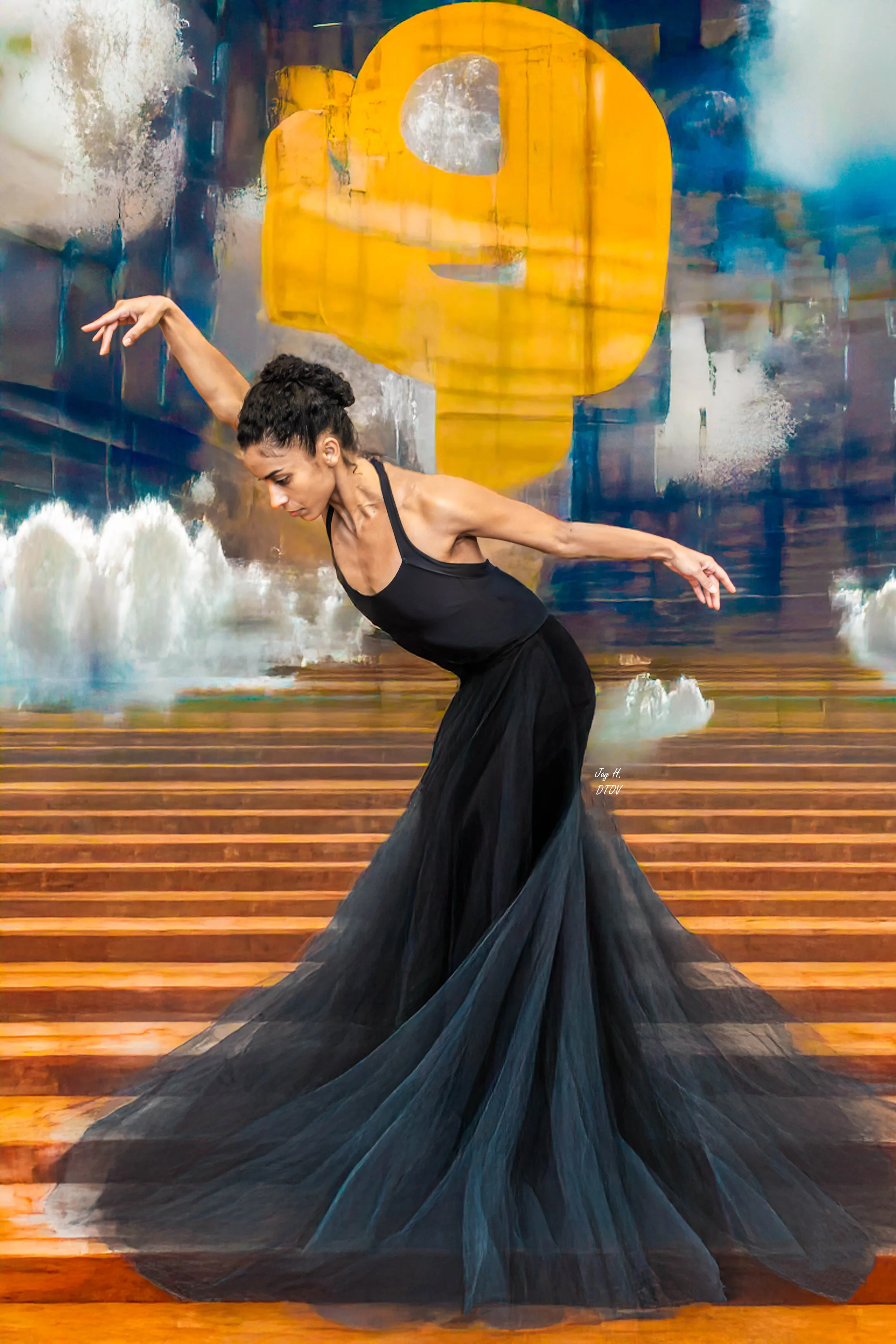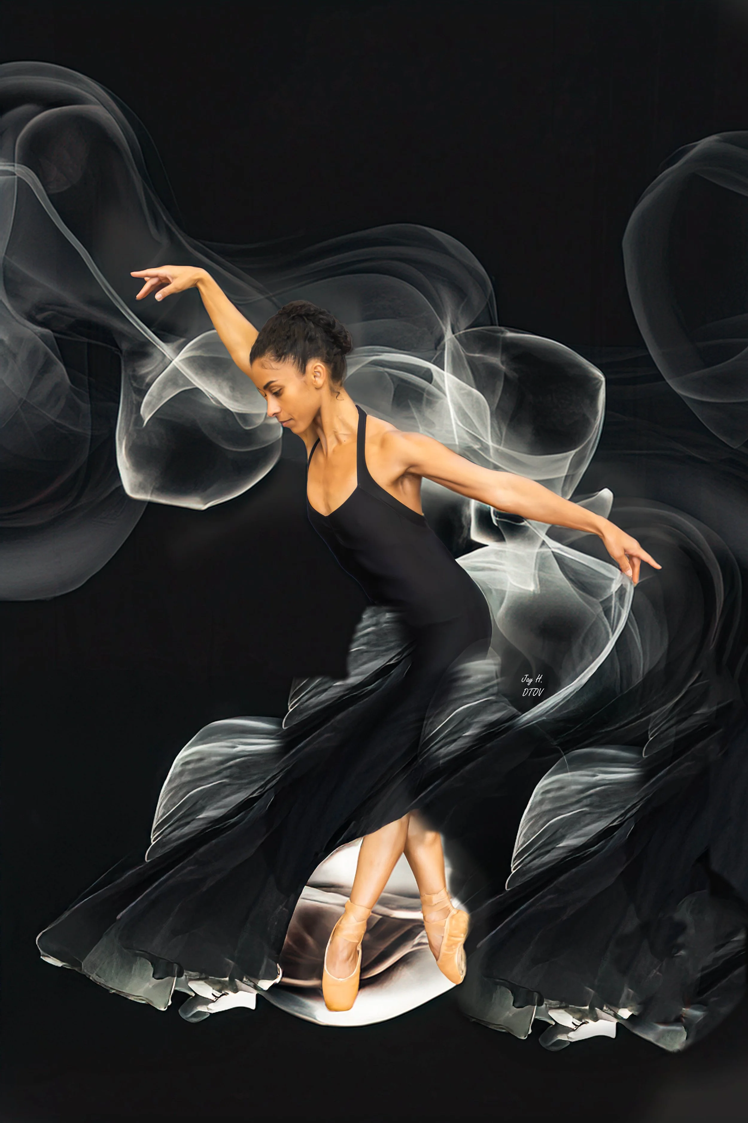 In shadow and vintage haze, a dancer in black sway,